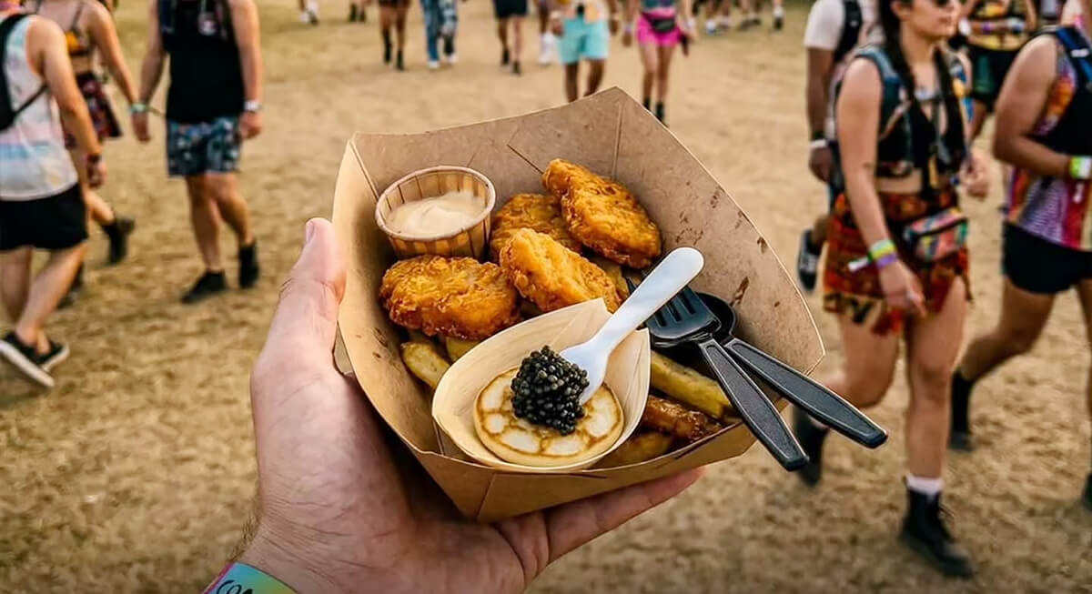 One menu featured chicken nuggets topped with caviar for $150. Caviar prices can run high, especially for premium varieties that cost hundreds of dollars per ounce, so the number itself is not surprising. What stands out is the pairing. Serving it on chicken nuggets feels very Coachella and turns a simple food stall into something people talk about.