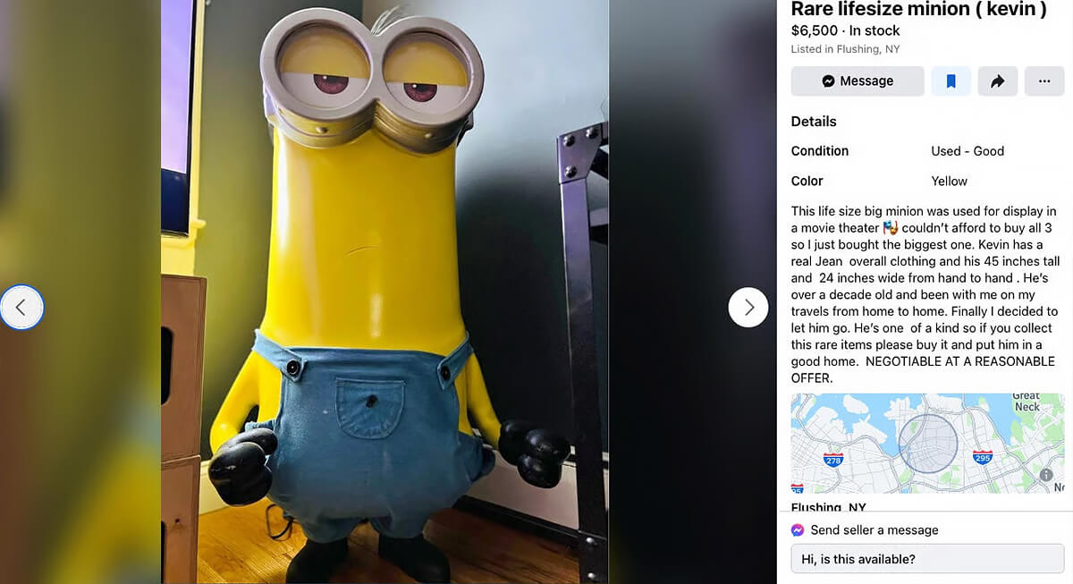This life-size Minion statue comes with a price closer to a used car, which immediately makes the listing stand out. The seller points out details like real denim overalls and mentions it spent years on display in a small apartment, suggesting a level of dedication that feels just as unusual as the item itself.
