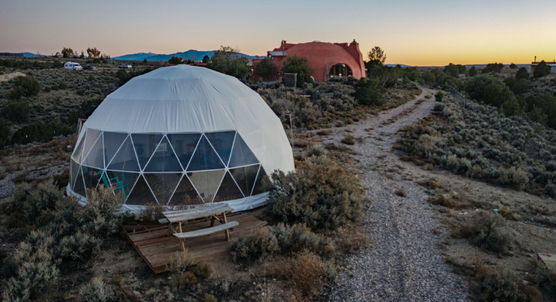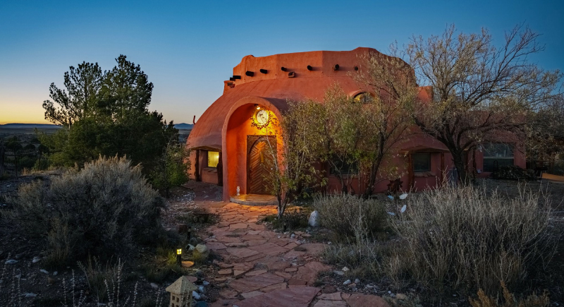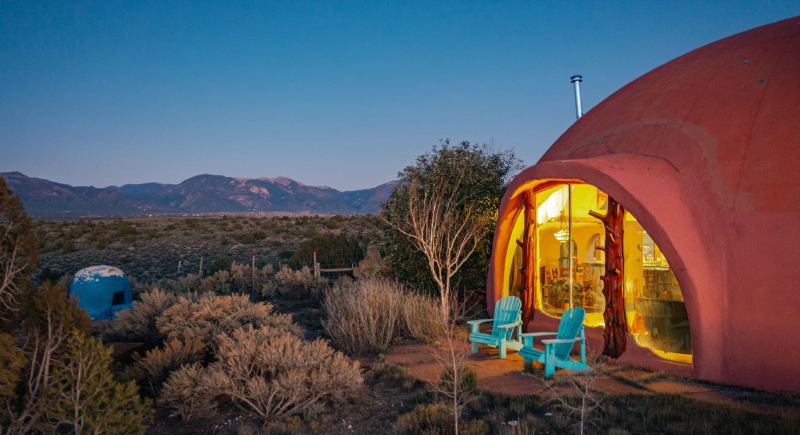 While it is not a classic adobe house, the Dreaming Dome borrows heavily from the building traditions of northern New Mexico. Inside, there are thick, earthen walls that help regulate indoor temperatures by staying cool during hot days and holding warmth after sunset. The passive temperature control reduces reliance on heating and air conditioning.