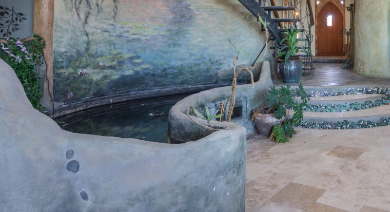 Along one side of the main living area, an indoor pond runs the length of the room. Black pebble channels cut through the floor and naturally draw the eye toward the kitchen. In the kitchen and dining area, bright turquoise flooring stands out against the surrounding earthen walls.
