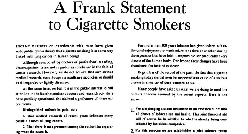 By the 1950s, tobacco executives had internal research linking cigarettes to cancer. Instead of warning the public, they launched media campaigns to cast doubt. The 1954 “Frank Statement to Cigarette Smokers,” published in more than 400 newspapers, promised concern and transparency while sidestepping the evidence. NCI’s Monograph 19 later detailed how these efforts used media to protect profits rather than public health.